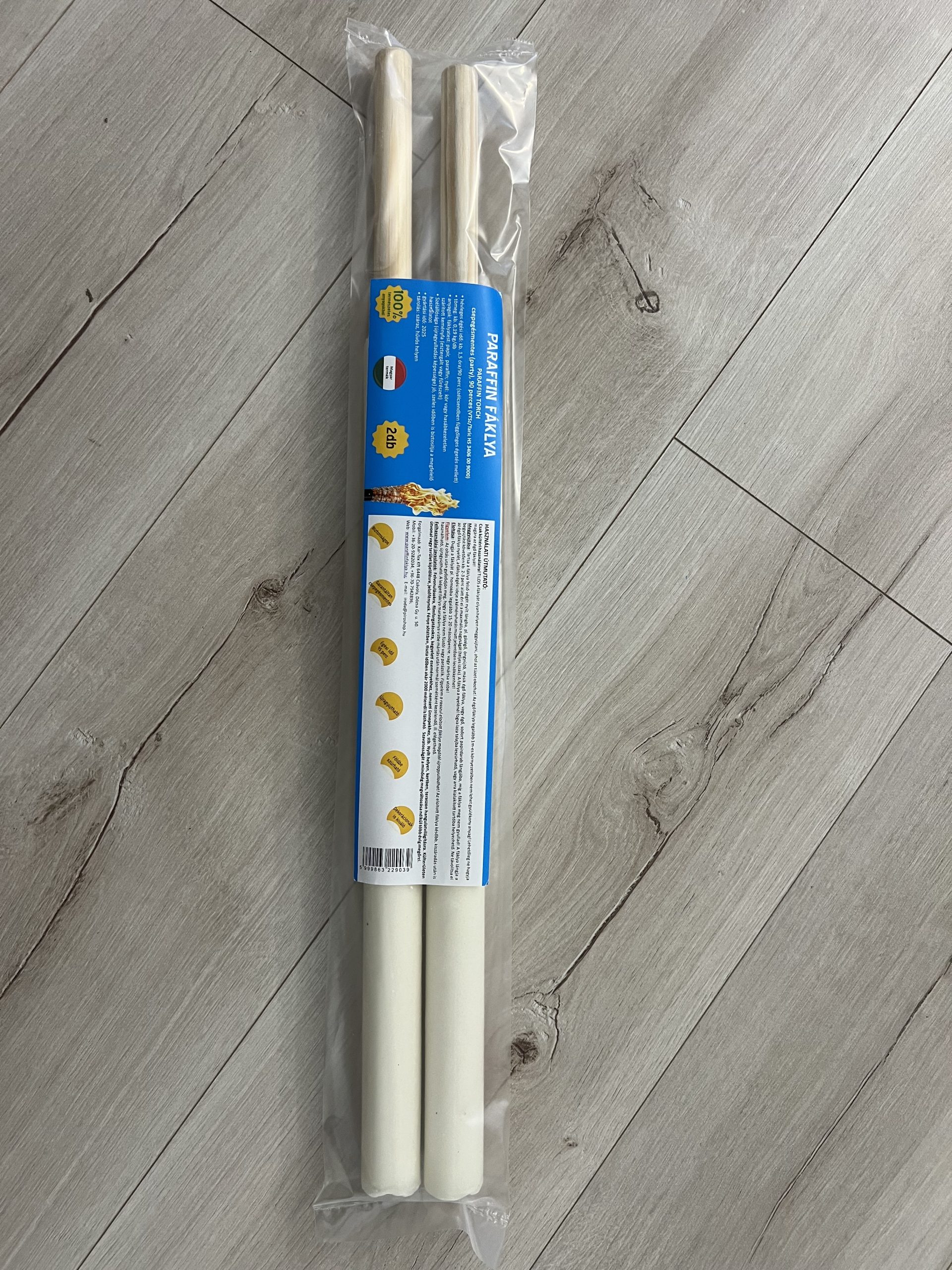 – **Anyagok:** Fáklyatest: papír, paraffin; Nyél: kezeletlen szárított keményfa (kör vagy hasáb formában)