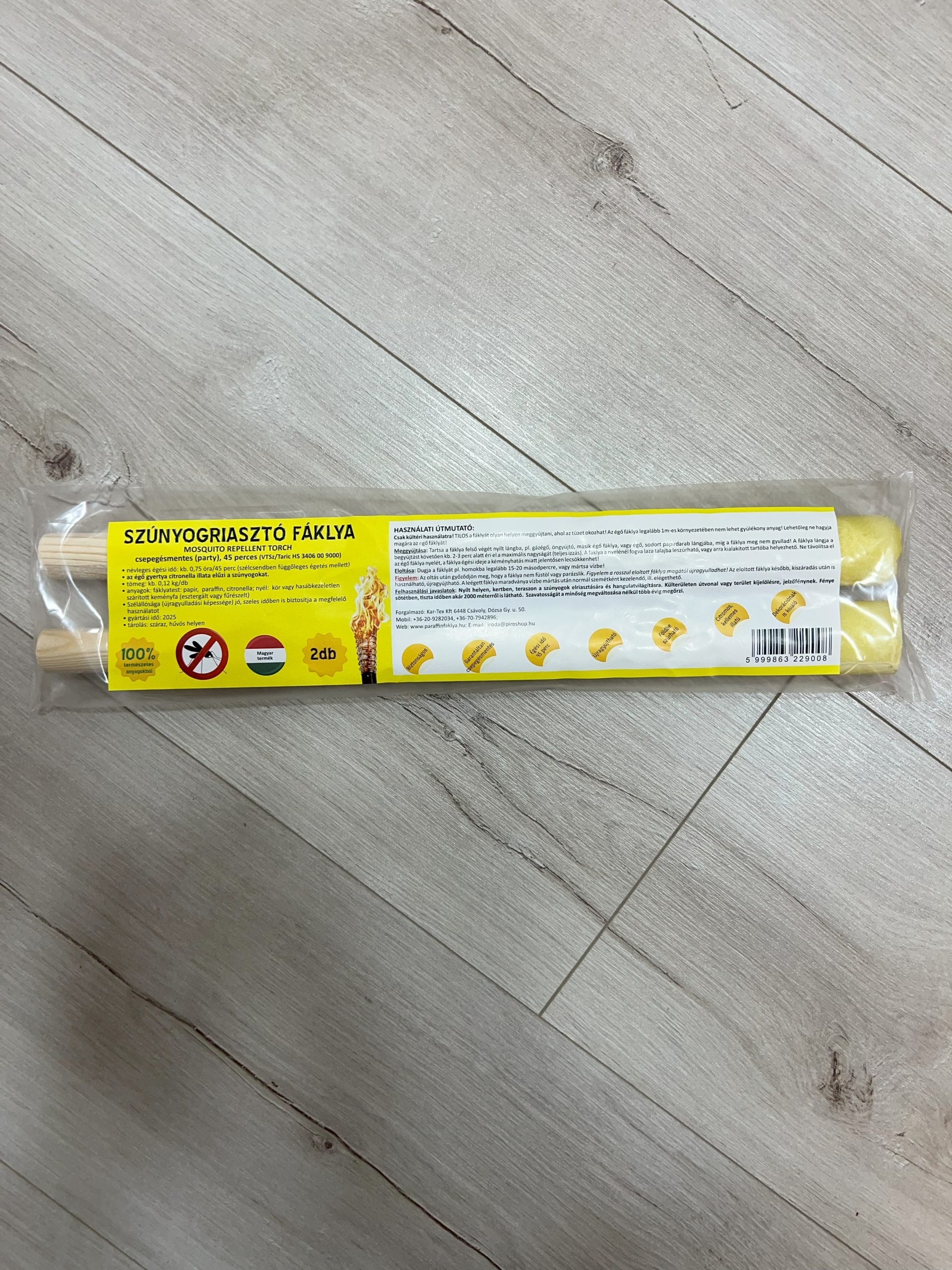 **Termék név:** **Szúnyogriasztó Csepegésmentes (Party) Paraffinfáklya – 45 perces** *(VTSZ/TARIC HS 3406 00 9000)*